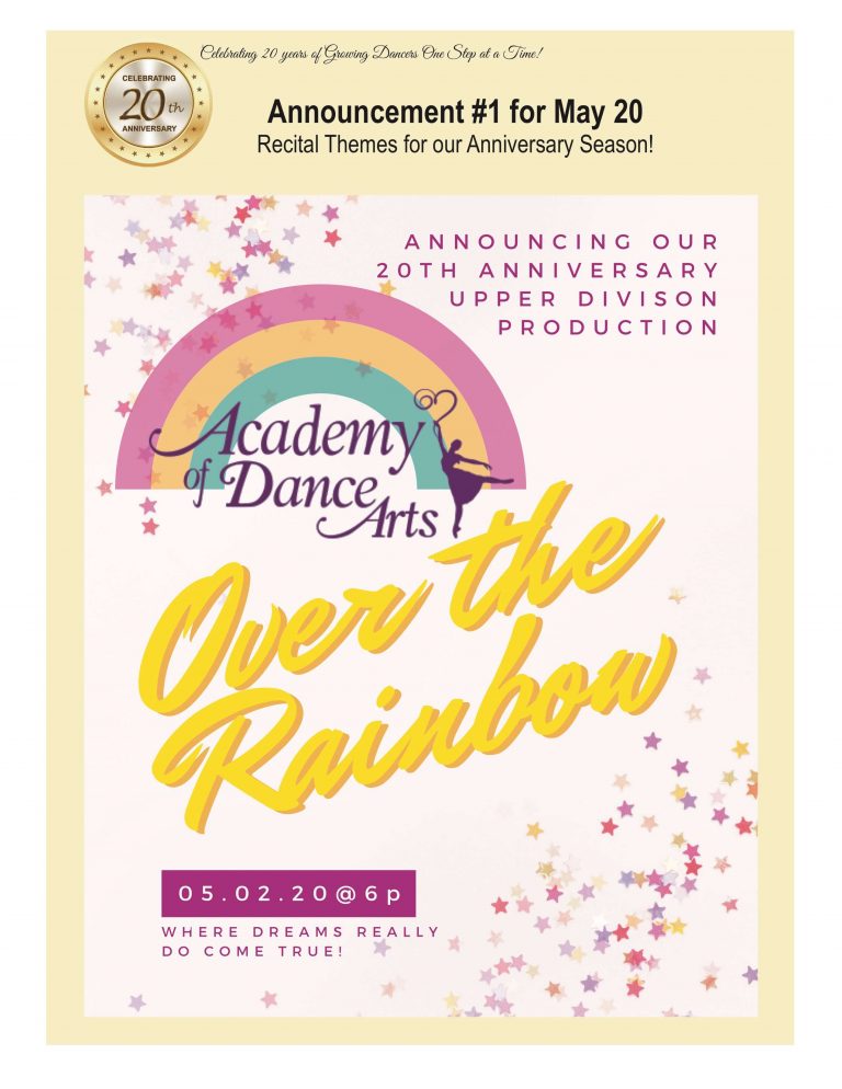 For Ms.Julie’s 20th Anniversary monthly announcement, we are thrilled to share the preview of our Over the Rainbow Cast of 2020 Seniors! Congratulations to this group of kind and beautiful dancers who are eager to bring our Season’s tale to life! 🙂