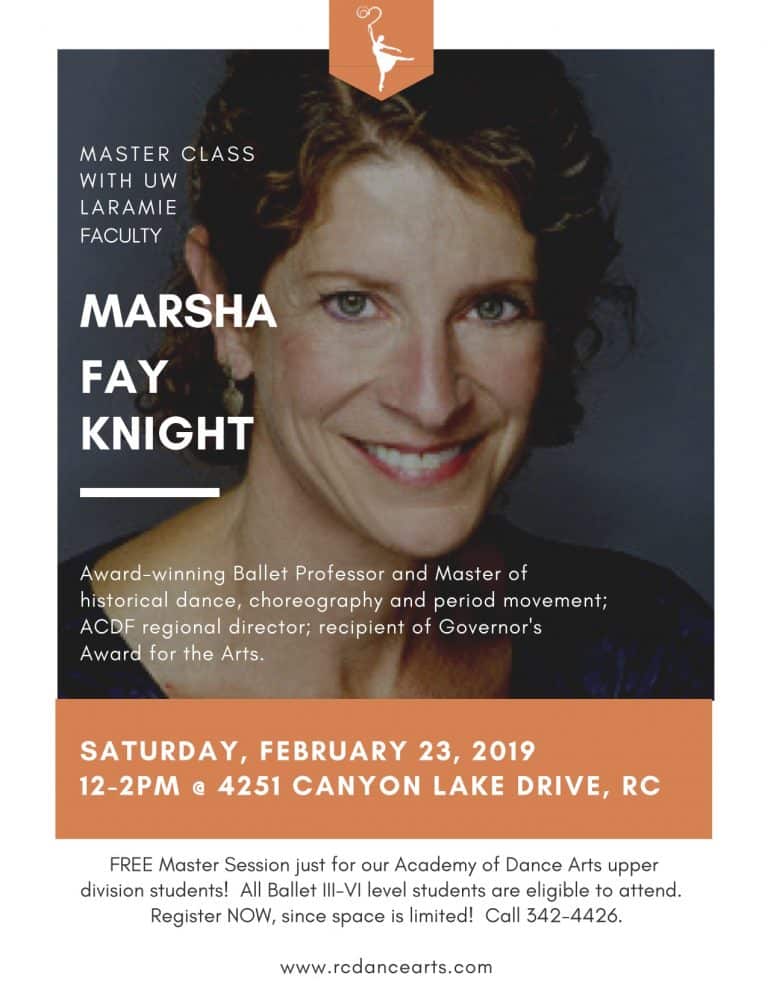 We’re so excited to host a masterclass with the award-winning Ballet Professor and Julliard, Stanford, RAD, Vaganova and London-trained Master Teacher, Marsha Fay Knight. Saturday, February 23, 2019 12-2PM @ 4251 Canyon Lake Drive This FREE session is just for our Academy of Dance Arts upper division students! All Ballet III-VI level students are eligible…
