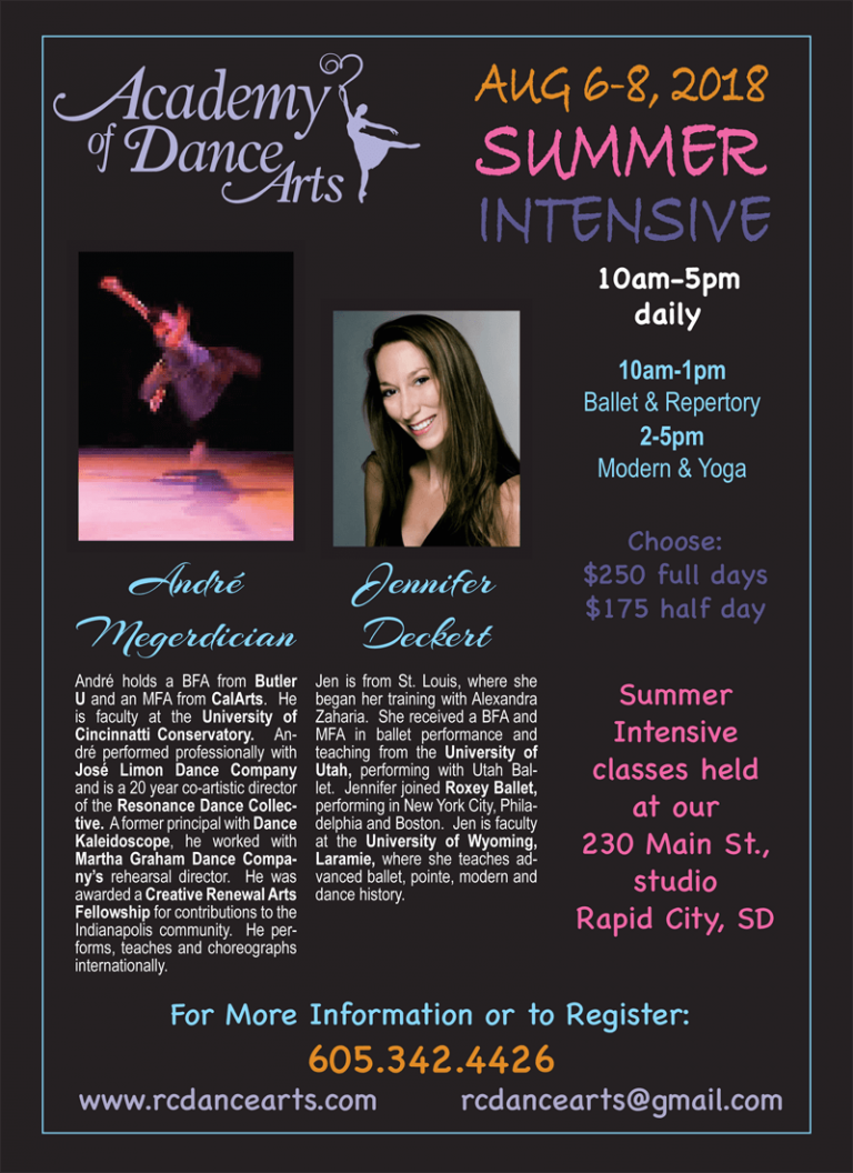 Awesome opportunity to work with two outstanding professionals in one intensive for upper intermediate and advanced dancers! This 3-day intensive will be held at our 230 Main St. Studio, Rapid City, SD. 10am-1pm: Ballet and Repertory 2pm-5pm: Modern and Yoga Choose: Full Day Classes for $250 or: Half Day Classes for $175 For More Information…